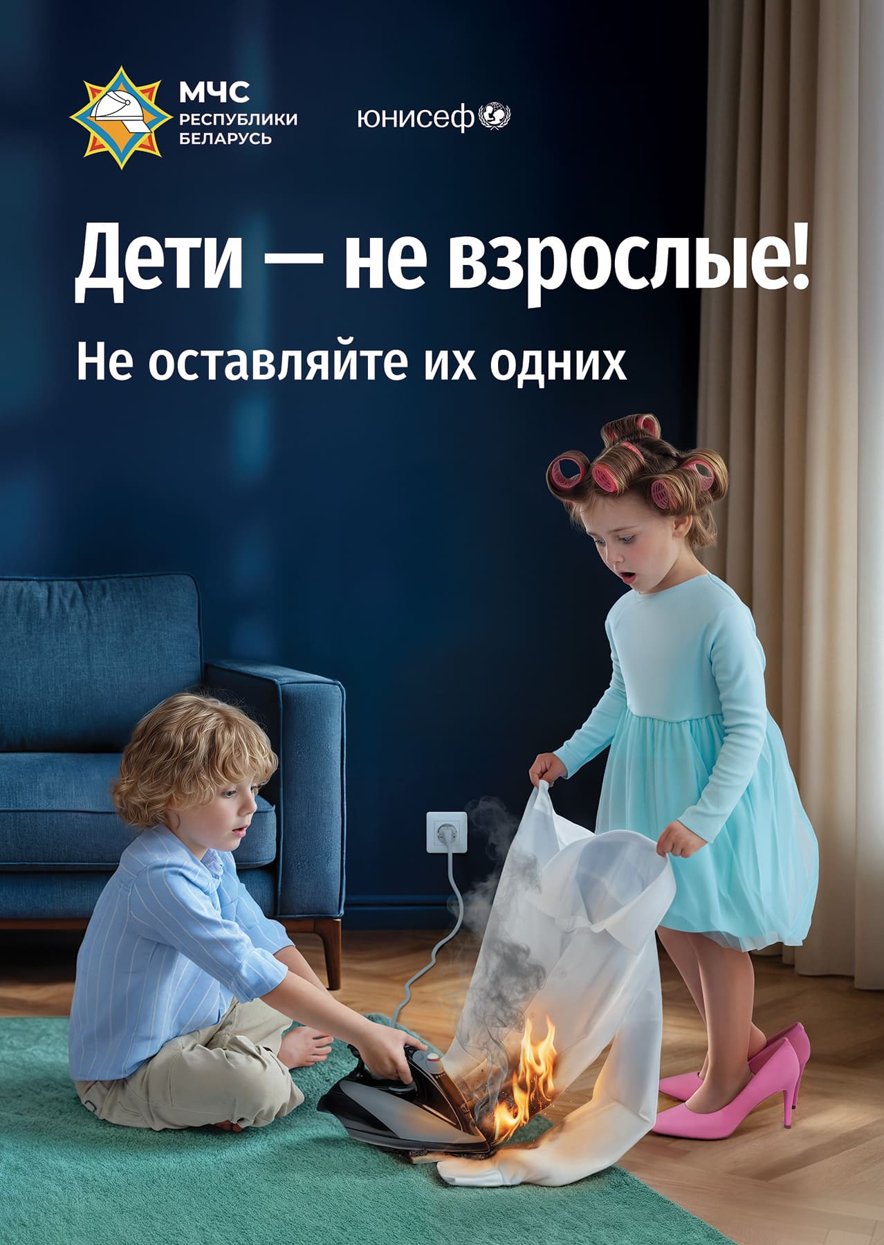 Чтобы привлечь внимание родителей к проблеме гибели и травматизма детей дошкольного и младшего школьного возраста на пожарах и водоемах, МЧС Республики Беларусь при поддержке Представительства Детского Фонда ООН (ЮНИСЕФ) в Республике Беларусь разработана новая информационная кампания «Дети – не взрослые! Не оставляйте их одних!», которая стартует с января 2026 и продлится до конца года.